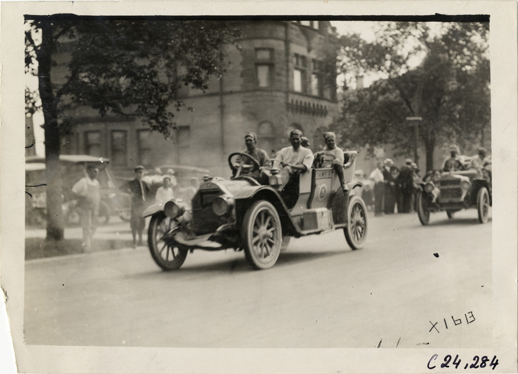 View of motorists in Chalmers car no. 5 during the 1910 Glidden Tour. Stamped on back: "Spooner & Wells, Inc., photographers, telephone North 1745. 1231 Woodward Ave., Detroit, Mich. Detroit, 1231 Woodward, New York, 1931 Broadway." Handwritten on back: "Tours--Glidden Tour, 1910."
