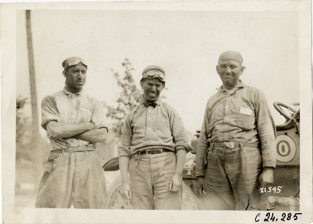 View of three motorists during the 1910 Glidden Tour. Stamped on back: "Spooner & Wells, Inc., photographers, telephone North 1745. 1231 Woodward Ave., Detroit, Mich. Detroit, 1231 Woodward, New York, 1931 Broadway." Handwritten on back: "Tours--Glidden Tour, 1910."