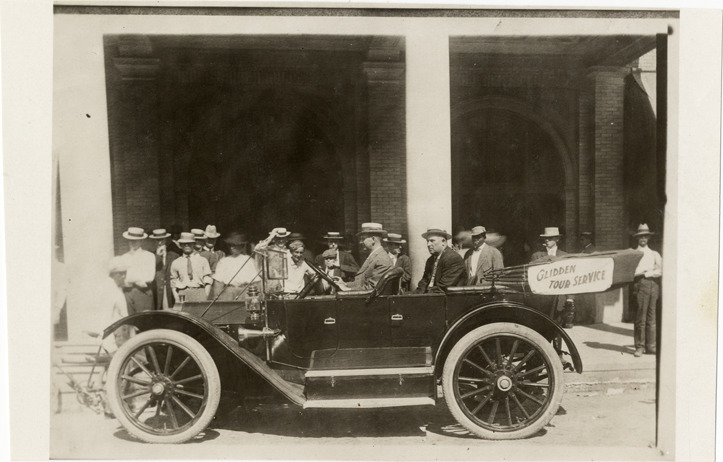 View of motorists in car in front of hotel during the 1910 Glidden Tour. "Glidden Tour service" sign is displayed on car; spectators in background. Handwritten on back: "Tours--Glidden Tour, 1910."