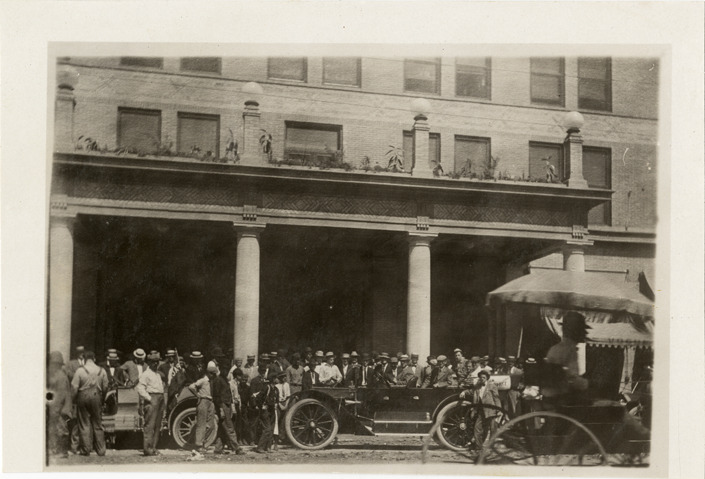 Motorists, spectators and automobiles in front of hotel, 1910 Glidden Tour