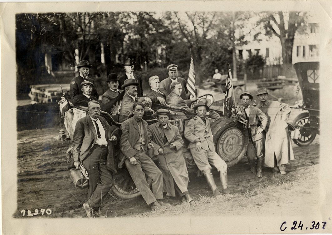 View of group of men posing with Chalmers car during the 1911 Glidden Tour. Stamped on back: "Spooner & Wells, Inc., photographers, telephones 3472-3473 Columbus, 1931 Broadway, New York." Handwritten on back: "Tours--Glidden Tour, 1911."