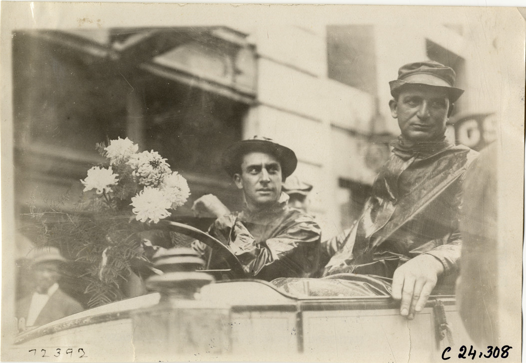 Close-up view of driver and passenger in car during the 1911 Glidden Tour. Driver holds a bouquet of flowers. Stamped on back: "Spooner & Wells, Inc., photographers, telephones 3472-3473 Columbus, 1931 Broadway, New York." Handwritten on back: "Tours--Glidden Tour, 1911."