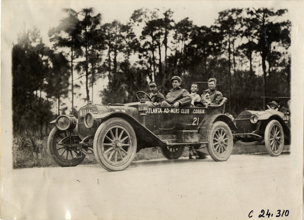 View of motorists posing in Corbin car no. 21 on rural dirt road during the 1911 Glidden Tour. Car was entered by the Atlanta Ad Men's Club. Stamped on back: "Spooner & Wells, Inc., photographers, telephones 3472-3473 Columbus, 1931 Broadway, New York." Handwritten on back: "Tours--Glidden Tour, 1911."