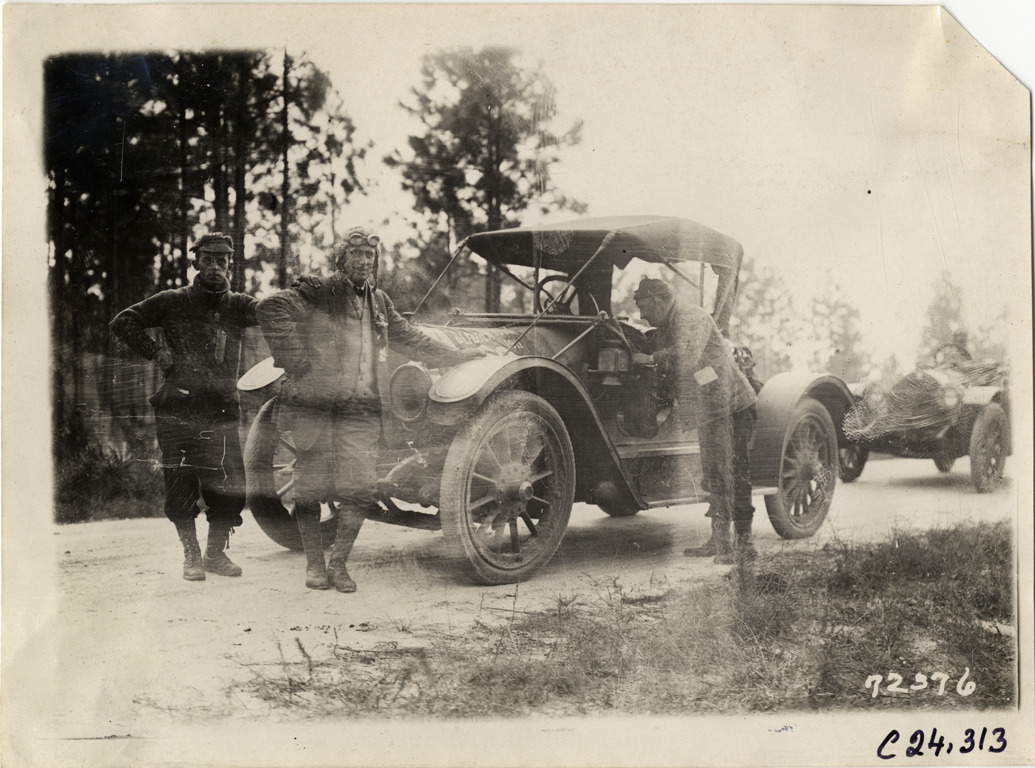View of motorists posing with car on rural dirt road during the 1911 Glidden Tour. Stamped on back: "Spooner & Wells, Inc., photographers, telephones 3472-3473 Columbus, 1931 Broadway, New York." Handwritten on back: "Tours--Glidden Tour, 1911."