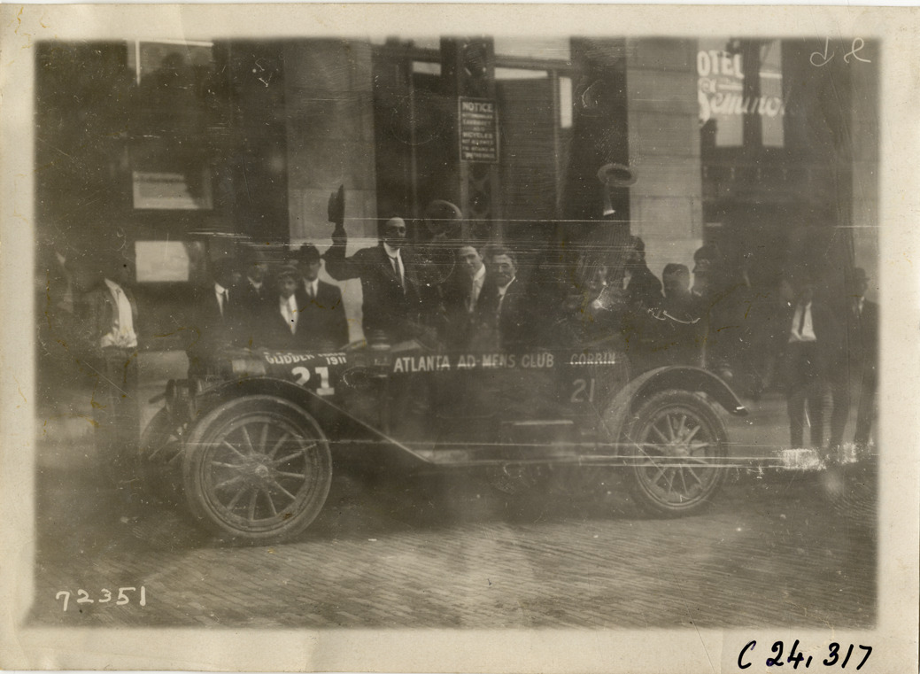 View of motorists posing in Corbin car no. 21 during the 1911 Glidden Tour. Several men raise their hats; car was entered by the Atlanta Ad Men's Club. Hotel and spectators in background. Stamped on back: "Spooner & Wells, Inc., photographers, telephones 3472-3473 Columbus, 1931 Broadway, New York." Handwritten on back: "Tours--Glidden Tour, 1911."