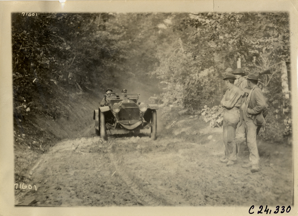 View of motorists in car traveling on muddy forest road during the 1911 Glidden Tour. Three men, one holding a rifle, stand on roadside. Handwritten on back: "Tours--Glidden Tour, 1911."