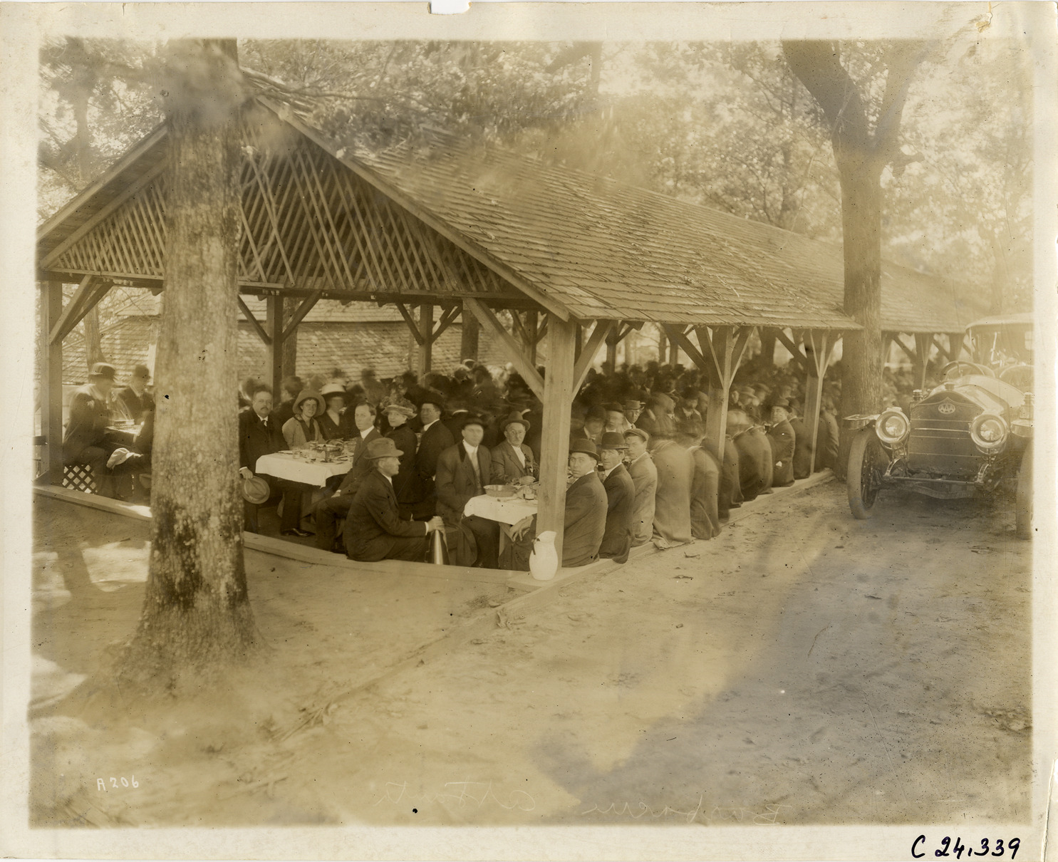 View of men and women dining at long, cloth-covered tables under a wooden picnic shelter during the 1911 Glidden Tour. Automobile is partially visible on right. Stamped on back: "Spooner & Wells, Inc., photographers, telephones 3472-3473 Columbus, 1931 Broadway, New York." Handwritten on back: "Tours--Glidden Tour, 1911."