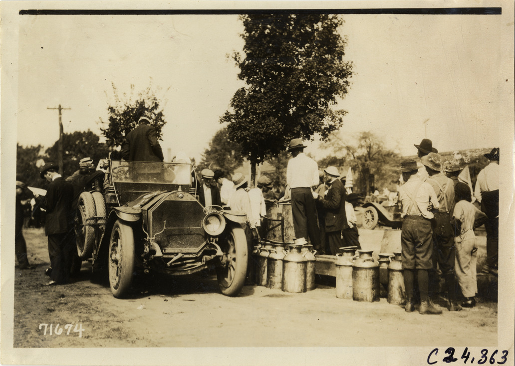 View of car parked next to row of metal milk cans during the 1911 Glidden Tour. Spectators stand nearby. Stamped on back: "Spooner & Wells, Inc., photographers, telephones 3472-3473 Columbus, 1931 Broadway, New York." Handwritten on back: "Tours--Glidden Tour, 1911."