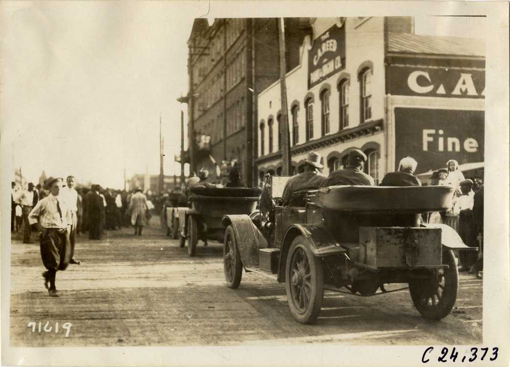 Motorists in automobiles lined up in street, 1911 Glidden Tour