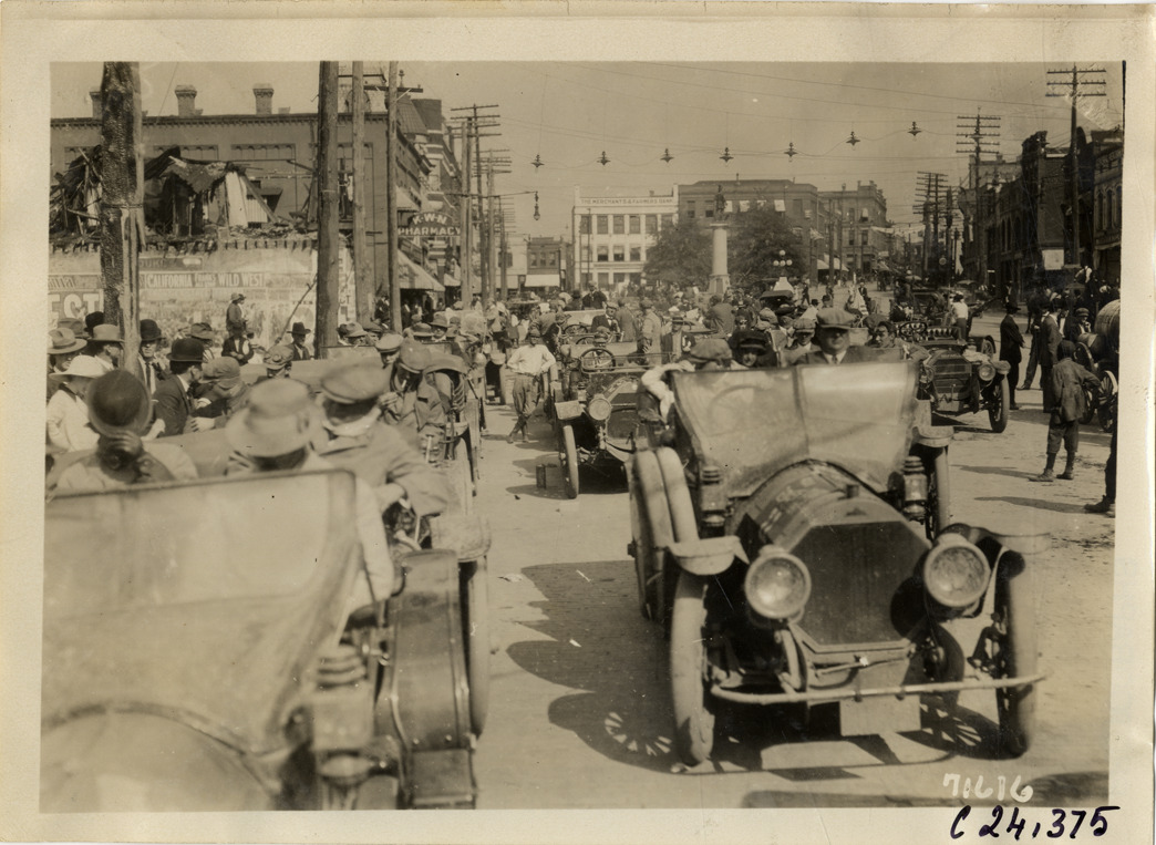 Automobiles lined up on crowded street in Spartanburg, South Carolina, 1911 Glidden Tour
