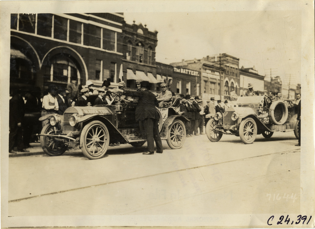 View of motorists in two cars in street during the 1911 Glidden Tour. Man stands next to car in foreground; Schacht car no. 20 on right. Commercial buildings in background. Stamped on back: "Spooner & Wells, Inc., photographers, telephones 3472-3473 Columbus, 1931 Broadway, New York." Handwritten on back: "Tours--Glidden Tour, 1911."