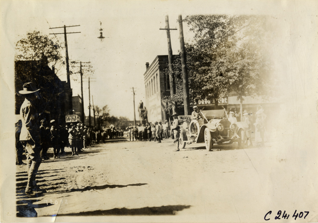 View of driver in car and soldiers in street during the 1911 Glidden Tour. Stamped on back: "Spooner & Wells, Inc., photographers, telephones 3472-3473 Columbus, 1931 Broadway, New York." Handwritten on back: "Tours--Glidden Tour, 1911."