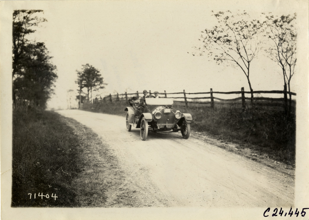 View of motorists in car traveling on rural dirt road during the 1911 Glidden Tour. Stamped on back: "Spooner & Wells, Inc., photographers, telephones 3472-3473 Columbus, 1931 Broadway, New York." Handwritten on back: "Tours--Glidden Tour, 1911."