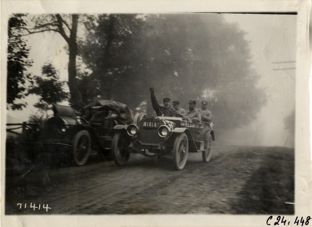Motorists in automobile passing an automobile on roadside, 1911 Glidden Tour