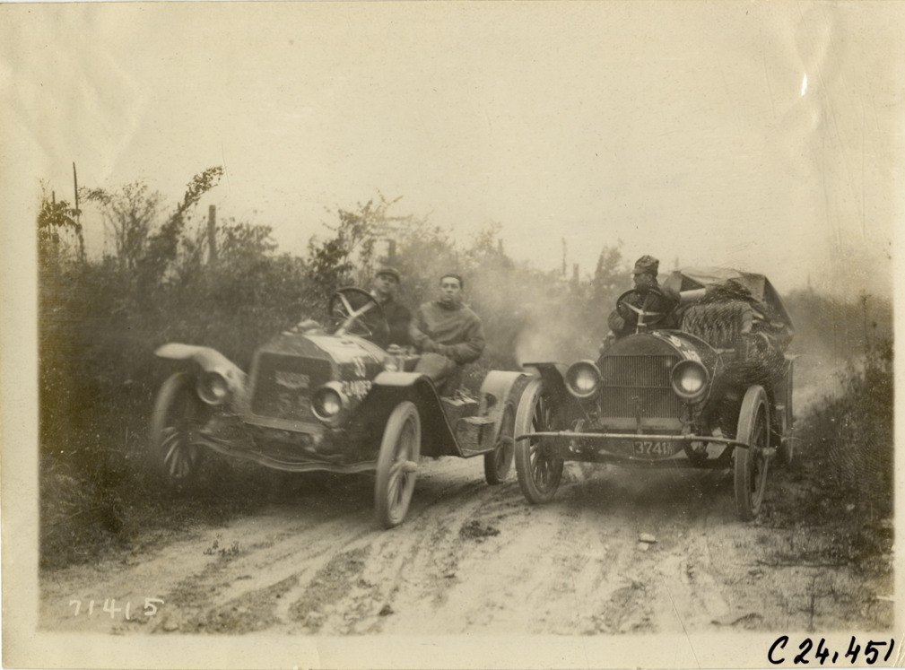 Motorists in Flanders automobile and unidentified automobile on rural road, 1911 Glidden Tour