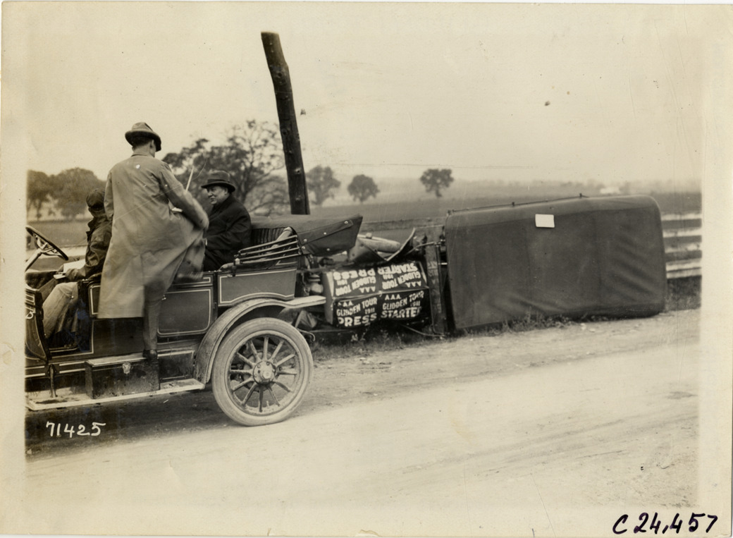 Overturned Pierce-Arrow press automobile on roadside, 1911 Glidden Tour