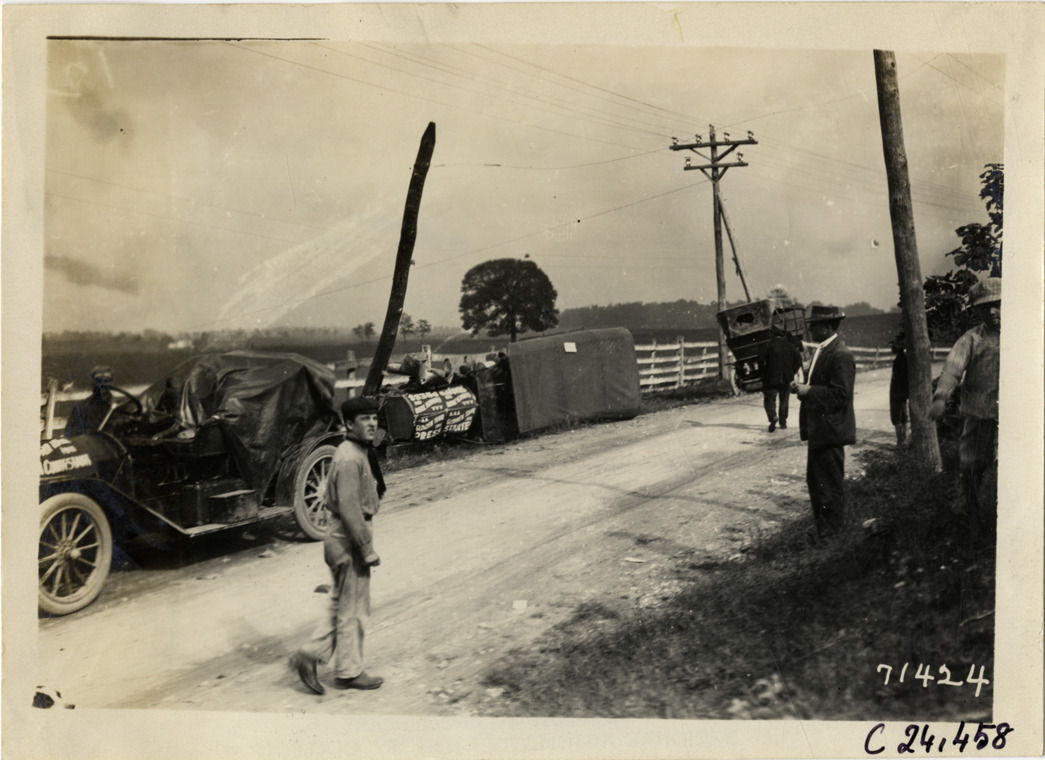 View of overturned Pierce-Arrow press car during the 1911 Glidden Tour. Car had collided with telegraph pole on roadside. Two additional cars on roadside; motorists walk in road. Stamped on back: "Spooner & Wells, Inc., photographers, telephones 3472-3473 Columbus, 1931 Broadway, New York." Handwritten on back: "Tours--Glidden Tour, 1911."