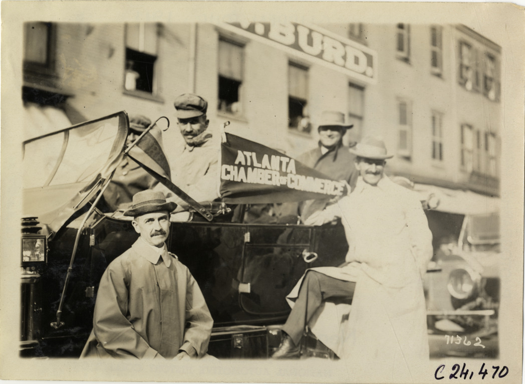 View of four men posing with car and "Atlanta Chamber of Commerce" pennant during the 1911 Glidden Tour. Stamped on back: "Spooner & Wells, Inc., photographers, telephones 3472-3473 Columbus, 1931 Broadway, New York." Handwritten on back: "Tours--Glidden Tour, 1911."
