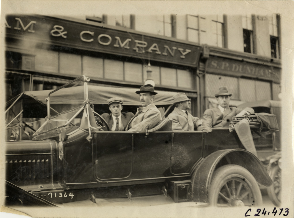 View of motorists in car during the 1911 Glidden Tour. Commercial buildings in background. Stamped on back: "Spooner & Wells, Inc., photographers, telephones 3472-3473 Columbus, 1931 Broadway, New York." Handwritten on back: "Tours--Glidden Tour, 1911."