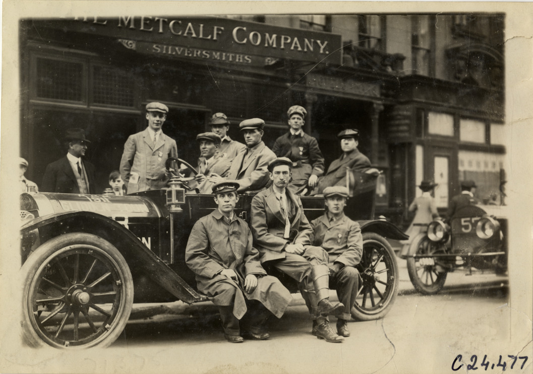 View of motorists posing with Marathon car no. 58 during the 1911 Glidden Tour. Marathon car no. 57 is partially visible on right; Metcalf Company, silversmiths, store in background. Stamped on back: "Spooner & Wells, Inc., photographers, telephones 3472-3473 Columbus, 1931 Broadway, New York." Handwritten on back: "Tours--Glidden Tour, 1911."