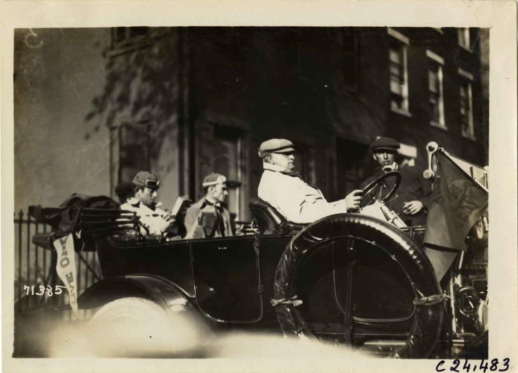 View of motorists in Cadillac car during the 1911 Glidden Tour. "Live Oak" pennant is displayed on car. Stamped on back: "Spooner & Wells, Inc., photographers, telephones 3472-3473 Columbus, 1931 Broadway, New York." Handwritten on back: "Tours--Glidden Tour, 1911."