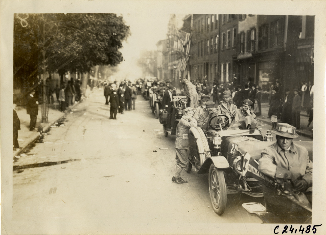 View of motorists with cars lined up in street during the 1911 Glidden Tour. Spectators in background. Stamped on back: "Spooner & Wells, Inc., photographers, telephones 3472-3473 Columbus, 1931 Broadway, New York." Handwritten on back: "Tours--Glidden Tour, 1911."