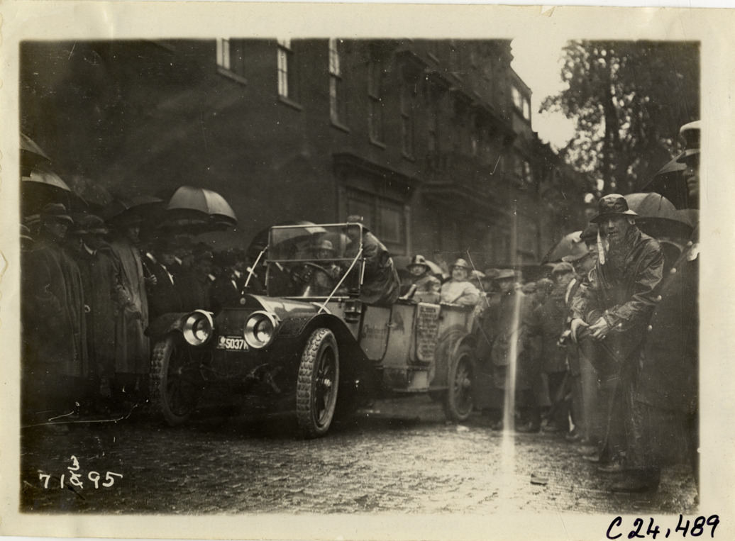 View of spectators, some holding umbrellas, surrounding Chalmers car on rainy day during the 1911 Glidden Tour. Stamped on back: "Spooner & Wells, Inc., photographers, telephones 3472-3473 Columbus, 1931 Broadway, New York." Handwritten on back: "Tours--Glidden Tour, 1911."