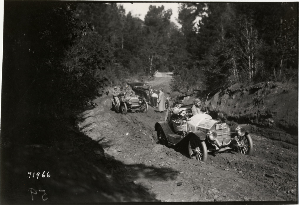 Motorists in automobiles traveling on rural road, 1911 Glidden Tour