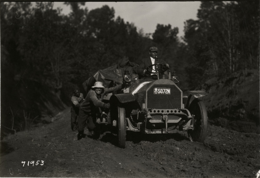 View of motorists pushing car on rutted rural dirt road during the 1911 Glidden Tour. Handwritten on back: "Tours--Glidden Tour, 1911."