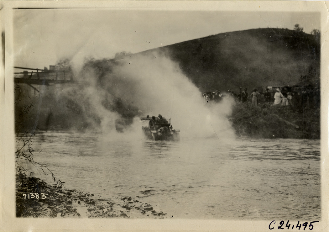 Distant view of motorists in car crossing Back Creek near Roanoke, Virginia during the 1911 Glidden Tour. Spectators watch from riverbank in background. Stamped on back: "Spooner & Wells, Inc., photographers, telephones 3472-3473 Columbus, 1931 Broadway, New York." Handwritten on back: "Tours--Glidden Tour, 1911."