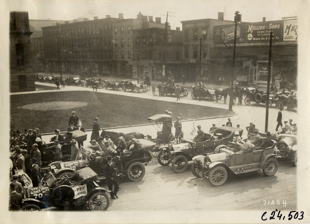 View of crowd surrounding cars in street in front of city hall at Jersey City, New Jersey during the 1911 Glidden Tour. Commercial buildings in background. Stamped on back: "Spooner & Wells, Inc., photographers, telephones 3472-3473 Columbus, 1931 Broadway, New York." Handwritten on back: "Tours--Glidden Tour, 1911."