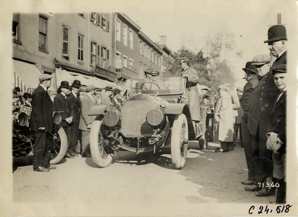 View of motorists in car, surrounded by spectators, at Trenton, New Jersey during the 1911 Glidden Tour. Commercial buildings in background. Stamped on back: "Spooner & Wells, Inc., photographers, telephones 3472-3473 Columbus, 1931 Broadway, New York." Handwritten on back: "Tours--Glidden Tour, 1911."