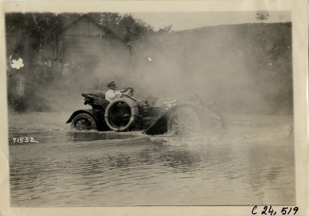 Motorists in automobile crossing Back Creek near Roanoke, Virginia, 1911 Glidden Tour