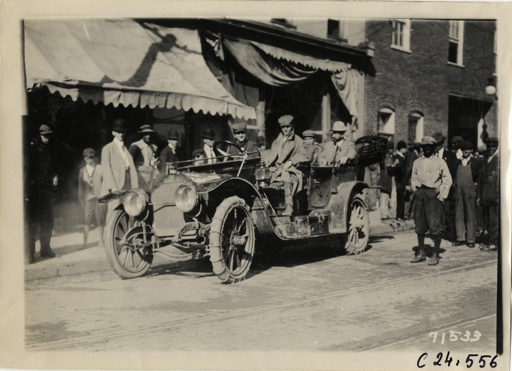 View of motorists posing in car during the 1911 Glidden Tour. Spectators and commercial buildings in background. Stamped on back: "Spooner & Wells, Inc., photographers, telephones 3472-3473 Columbus, 1931 Broadway, New York." Handwritten on back: "Tours--Glidden Tour, 1911."