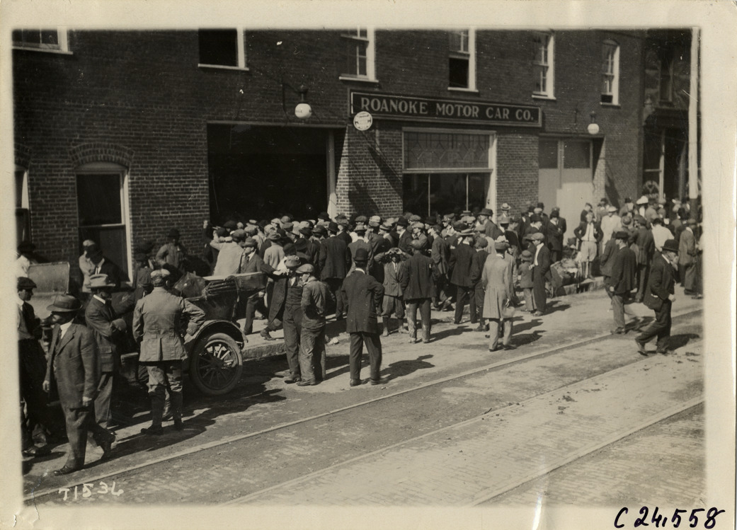 View of crowd standing in front of Roanoke Motor Car Co. building at Roanoke, Virginia during the 1911 Glidden Tour. Car is partially visible on left. Stamped on back: "Spooner & Wells, Inc., photographers, telephones 3472-3473 Columbus, 1931 Broadway, New York." Handwritten on back: "Tours--Glidden Tour, 1911."