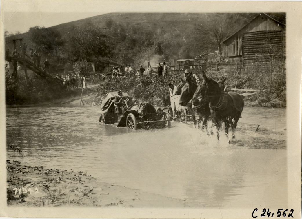 View of car and mule-drawn wagon crossing Back Creek near Roanoke, Virginia during the 1911 Glidden Tour. Spectators and barn on riverbank in background. Stamped on back: "Spooner & Wells, Inc., photographers, telephones 3472-3473 Columbus, 1931 Broadway, New York." Handwritten on back: "Tours--Glidden Tour, 1911."