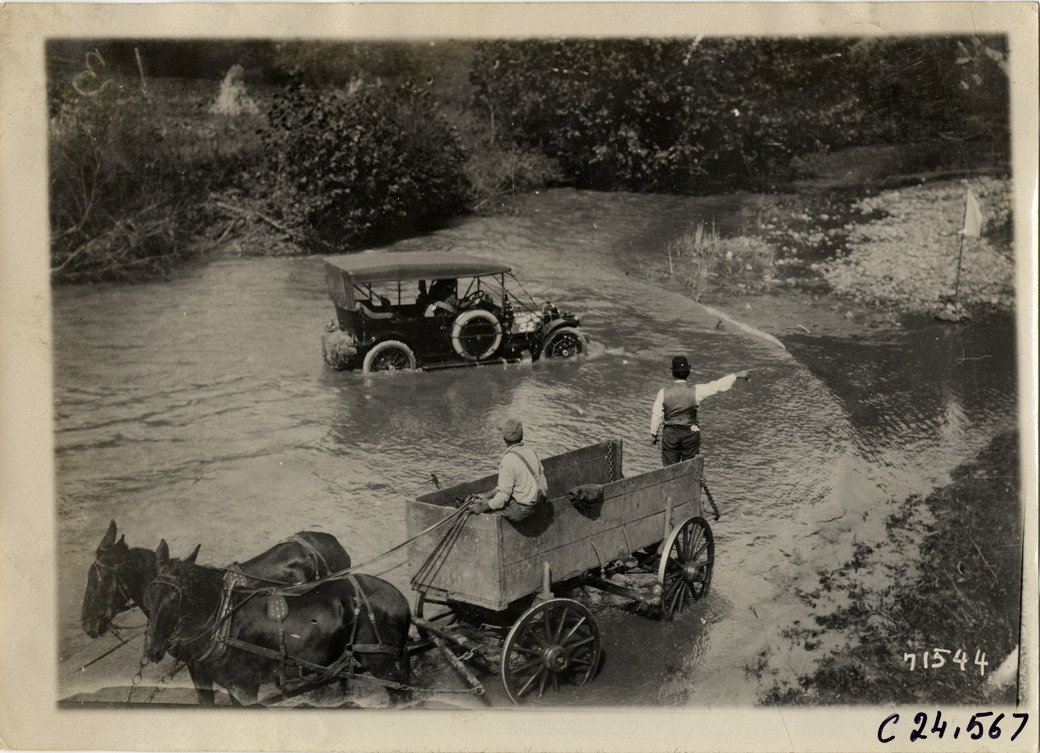 View of Packard car no. 52 and mule-drawn wagon crossing Back Creek near Roanoke, Virginia during the 1911 Glidden Tour. Stamped on back: "Spooner & Wells, Inc., photographers, telephones 3472-3473 Columbus, 1931 Broadway, New York." Handwritten on back: "Tours--Glidden Tour, 1911."