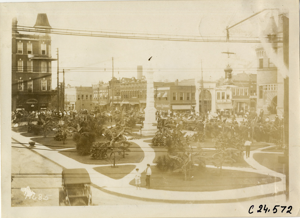 View of cars parked around public square and Confederate monument at Anderson, South Carolina during the 1911 Glidden Tour. Commercial buildings in background. Stamped on back: "Spooner & Wells, Inc., photographers, telephones 3472-3473 Columbus, 1931 Broadway, New York." Handwritten on back: "Tours--Glidden Tour, 1911."