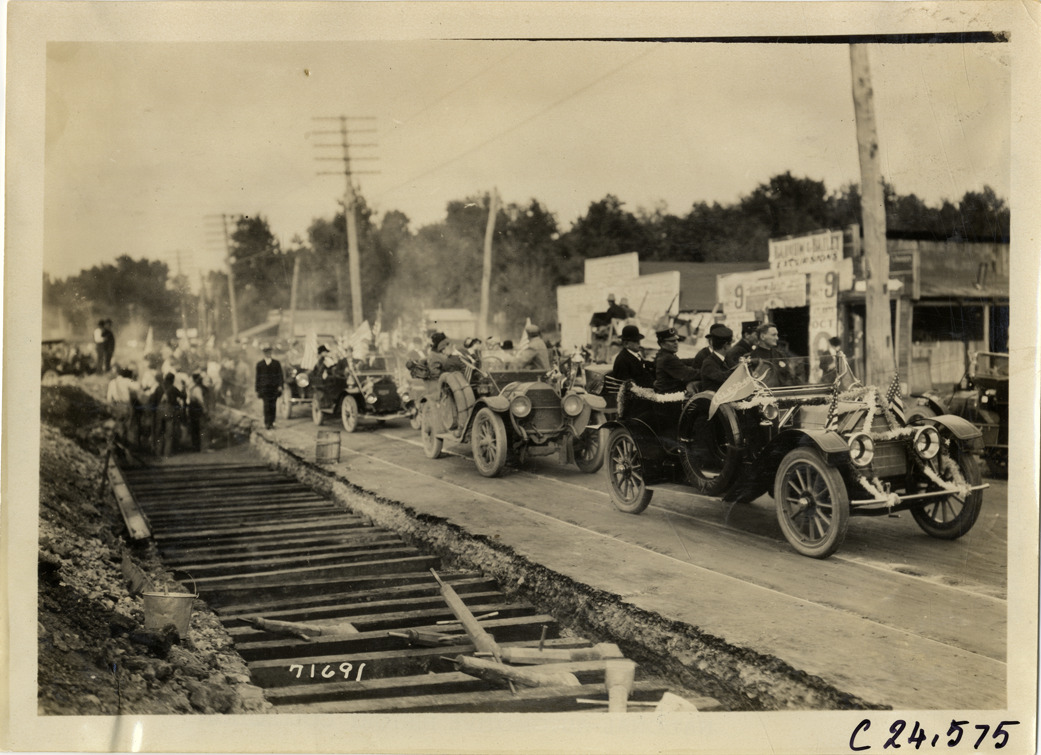 View of motorists in cars, decorated with flags and pennants, lined up in road during the 1911 Glidden Tour. Road construction in foreground; commercial buildings in background. Stamped on back: "Spooner & Wells, Inc., photographers, telephones 3472-3473 Columbus, 1931 Broadway, New York." Handwritten on back: "Tours--Glidden Tour, 1911."