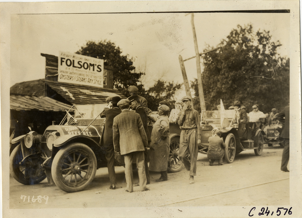 View of motorists in two cars parked in front of Folsom's restaurant during the 1911 Glidden Tour. Group of men stands next to car in foreground. Stamped on back: "Spooner & Wells, Inc., photographers, telephones 3472-3473 Columbus, 1931 Broadway, New York." Handwritten on back: "Tours--Glidden Tour, 1911."