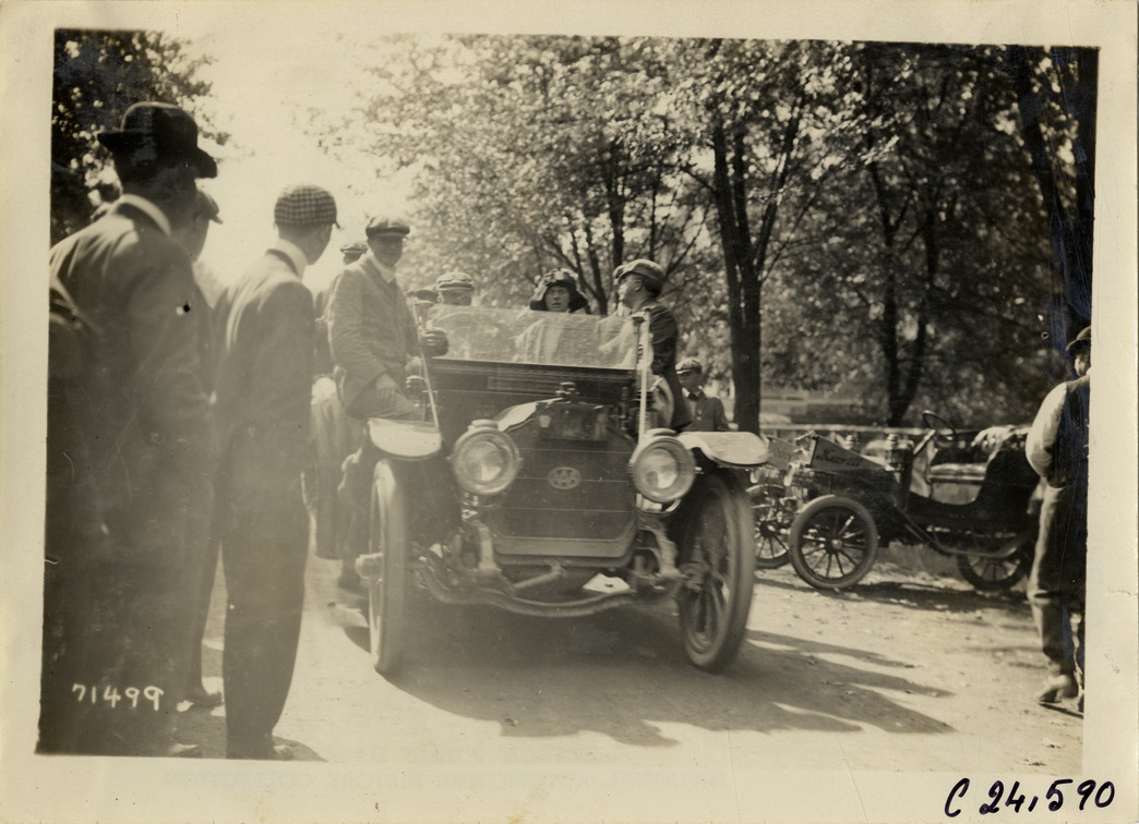 View of motorists in car during the 1911 Glidden Tour. Spectators in foreground; Maxwell car is visible on roadside. Stamped on back: "Spooner & Wells, Inc., photographers, telephones 3472-3473 Columbus, 1931 Broadway, New York." Handwritten on back: "Tours--Glidden Tour, 1911."