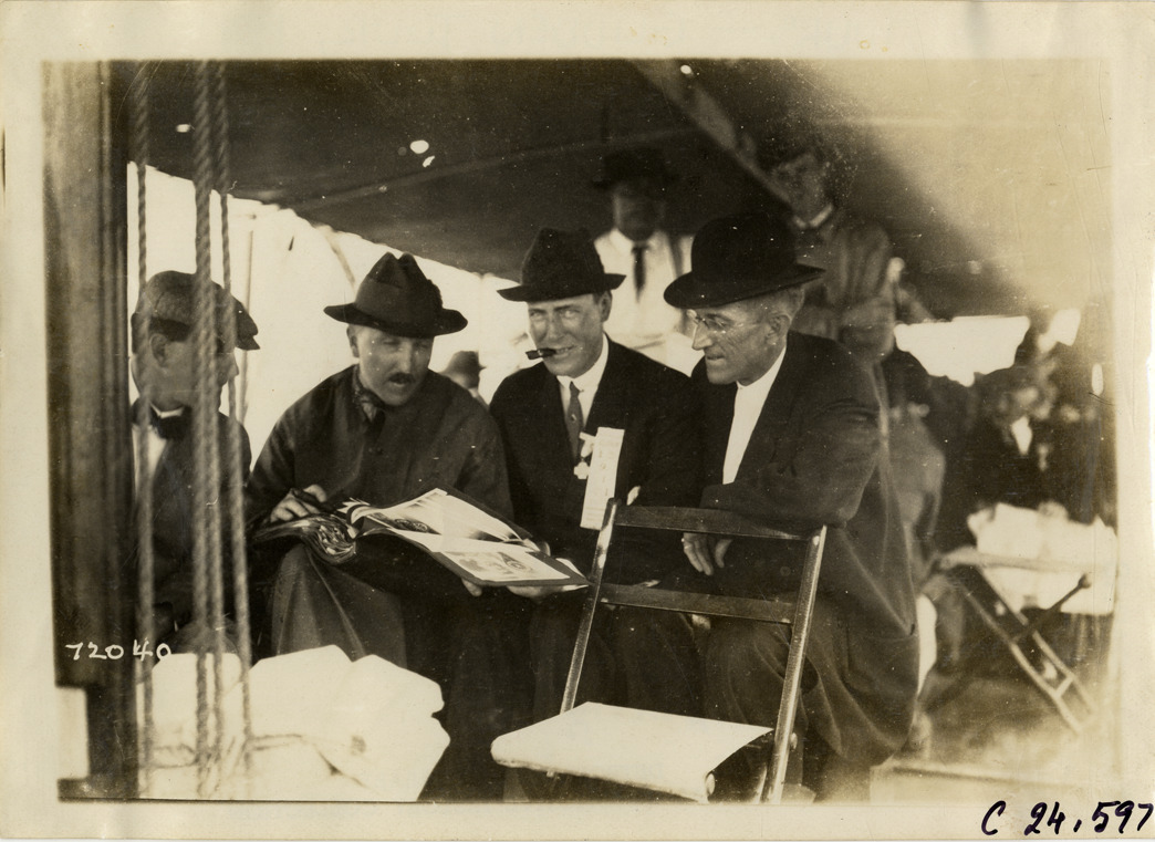 View of three men, sitting on folding chairs and looking at notebook or magazine during the 1911 Glidden Tour. Stamped on back: "Spooner & Wells, Inc., photographers, telephones 3472-3473 Columbus, 1931 Broadway, New York." Handwritten on back: "Tours--Glidden Tour, 1911."
