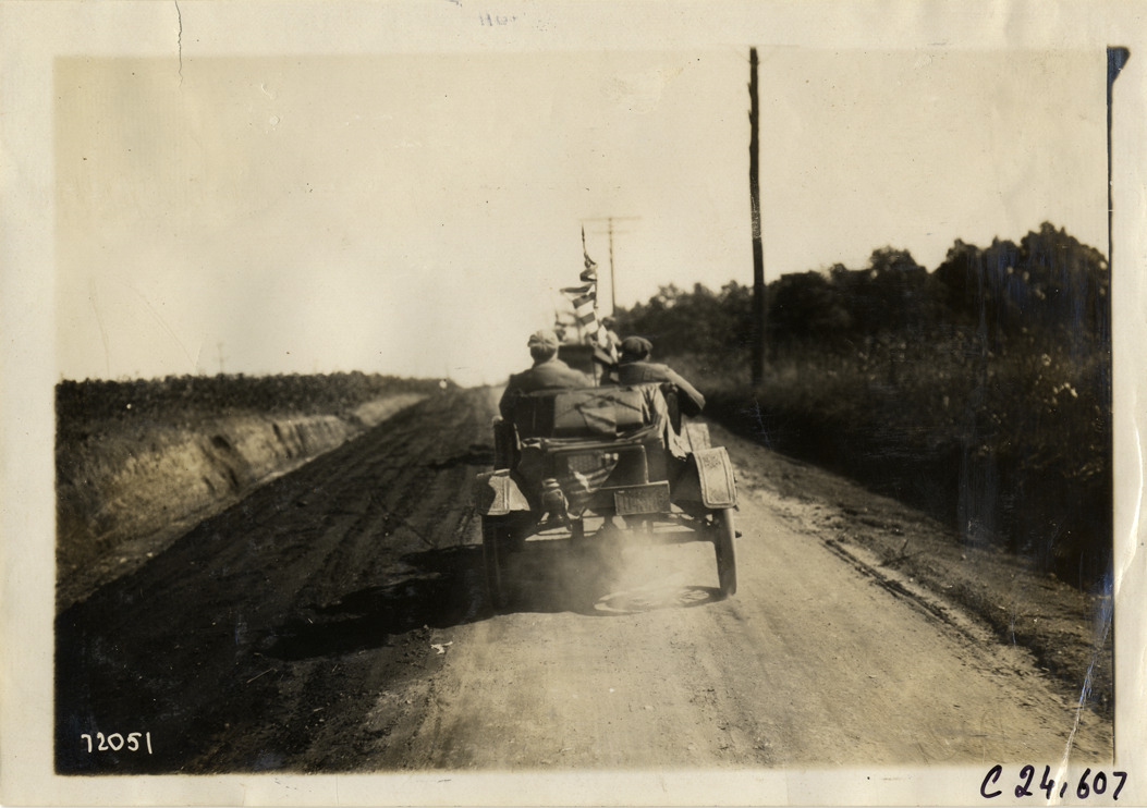 Rear view of motorists traveling in car on rural dirt road during the 1911 Glidden Tour. Stamped on back: "Spooner & Wells, Inc., photographers, telephones 3472-3473 Columbus, 1931 Broadway, New York." Handwritten on back: "Tours--Glidden Tour, 1911."