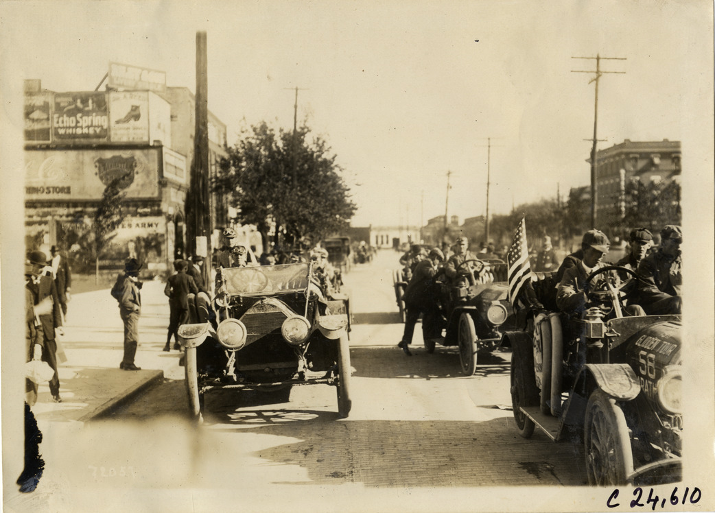 Motorists in automobiles lined up in street, 1911 Glidden Tour