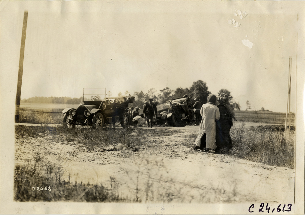 View of men surveying damaged car in ditch during the 1911 Glidden Tour. Two women and car on roadside. Stamped on back: "Spooner & Wells, Inc., photographers, telephones 3472-3473 Columbus, 1931 Broadway, New York." Handwritten on back: "Tours--Glidden Tour, 1911."