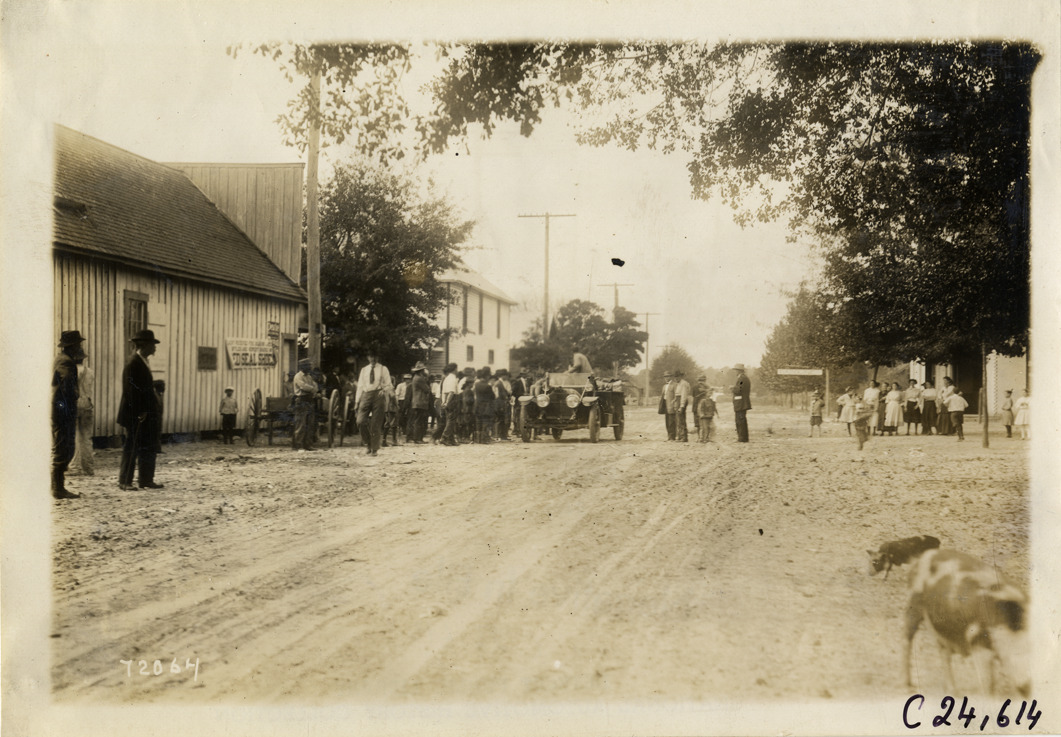 Spectators surrounding automobile in road, 1911 Glidden Tour
