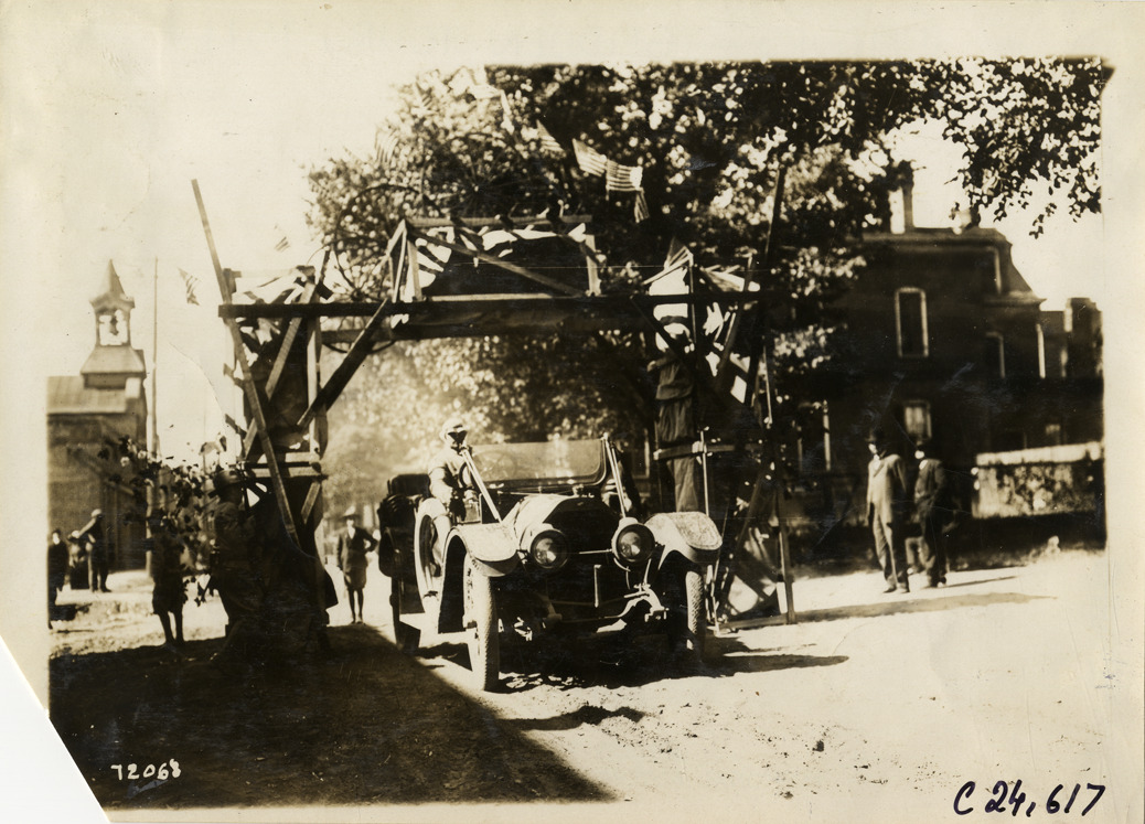 Automobile passing under decorative arch, 1911 Glidden Tour