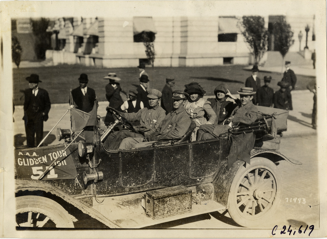 View of men and women in Cadillac car no. 51 during the 1911 Glidden Tour. Stamped on back: "Spooner & Wells, Inc., photographers, telephones 3472-3473 Columbus, 1931 Broadway, New York." Handwritten on back: "Tours--Glidden Tour, 1911."