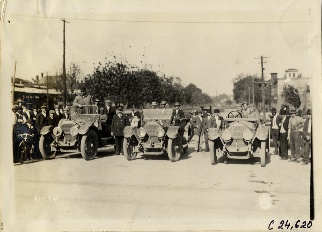 View of motorists posing in three automobiles, parked side by side, during the 1911 Glidden Tour. Spectators stand nearby. Stamped on back: "Spooner & Wells, Inc., photographers, telephones 3472-3473 Columbus, 1931 Broadway, New York." Handwritten on back: "Tours--Glidden Tour, 1911."