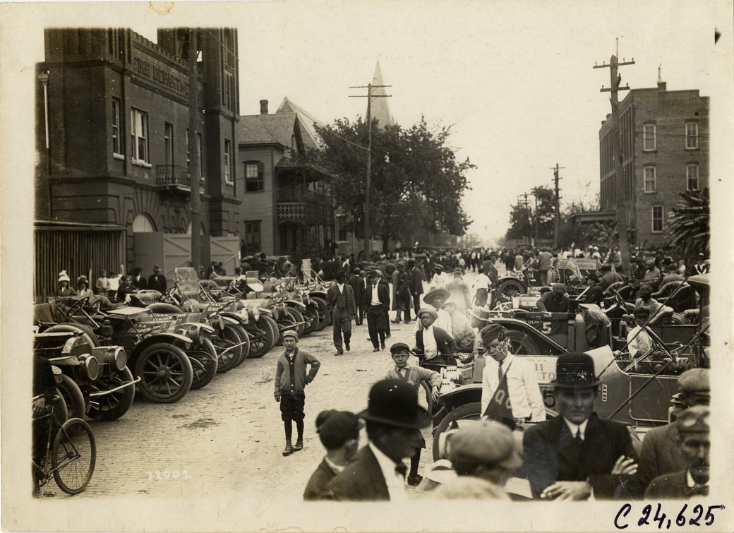 View of motorists and spectators with cars parked on street during the 1911 Glidden Tour. Fire station on left; boy stands in middle of street in foreground. Stamped on back: "Spooner & Wells, Inc., photographers, telephones 3472-3473 Columbus, 1931 Broadway, New York." Handwritten on back: "Tours--Glidden Tour, 1911."